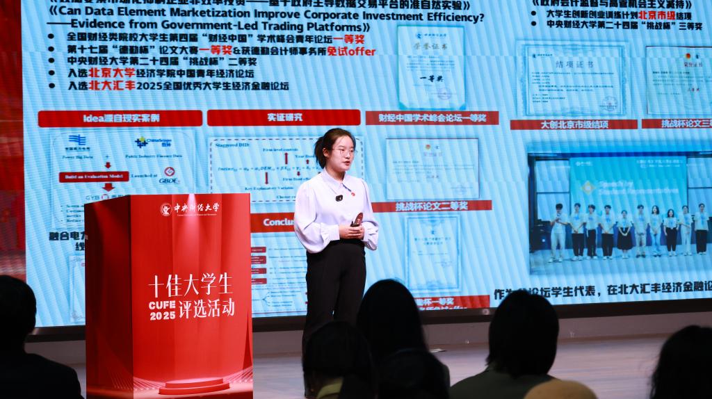 11月7日下午,中央财经大学2025年“十佳大学生”评选活动在沙河校区大学生活动中心融想多功能厅举行,来自各学院的16名候选人参加最终评审。我院2022级本科生曾月凭借良好的综合素质和精彩的现场表现,荣获2025年中央财经大学“十佳大学生”荣誉称号。