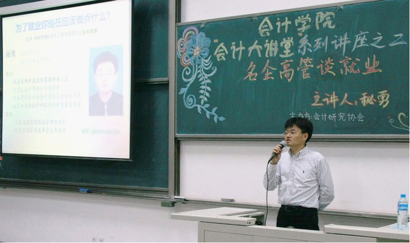 2011年4月12日晚上7点,由会计学院主办、会计研究协会承办的“2011年度会计大讲堂”系列讲座之二——名企高管谈就业在沙河校区主教216顺利举行。主讲嘉宾秘勇先生现任北京首都开发控股集团财务总监。会计学院副院长刘俊勇副教授,团总支书记林艺茹老师出席了本次讲座。