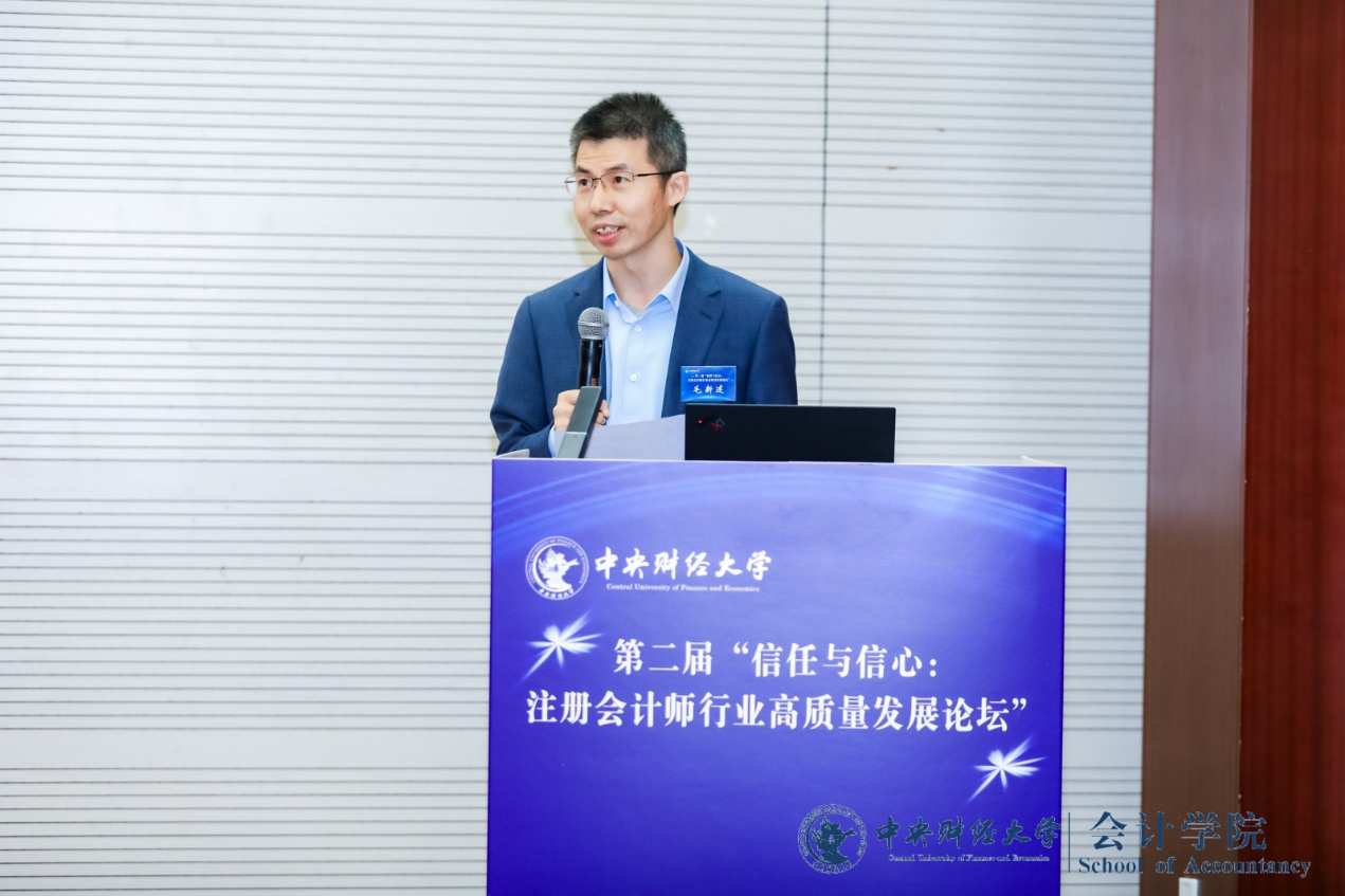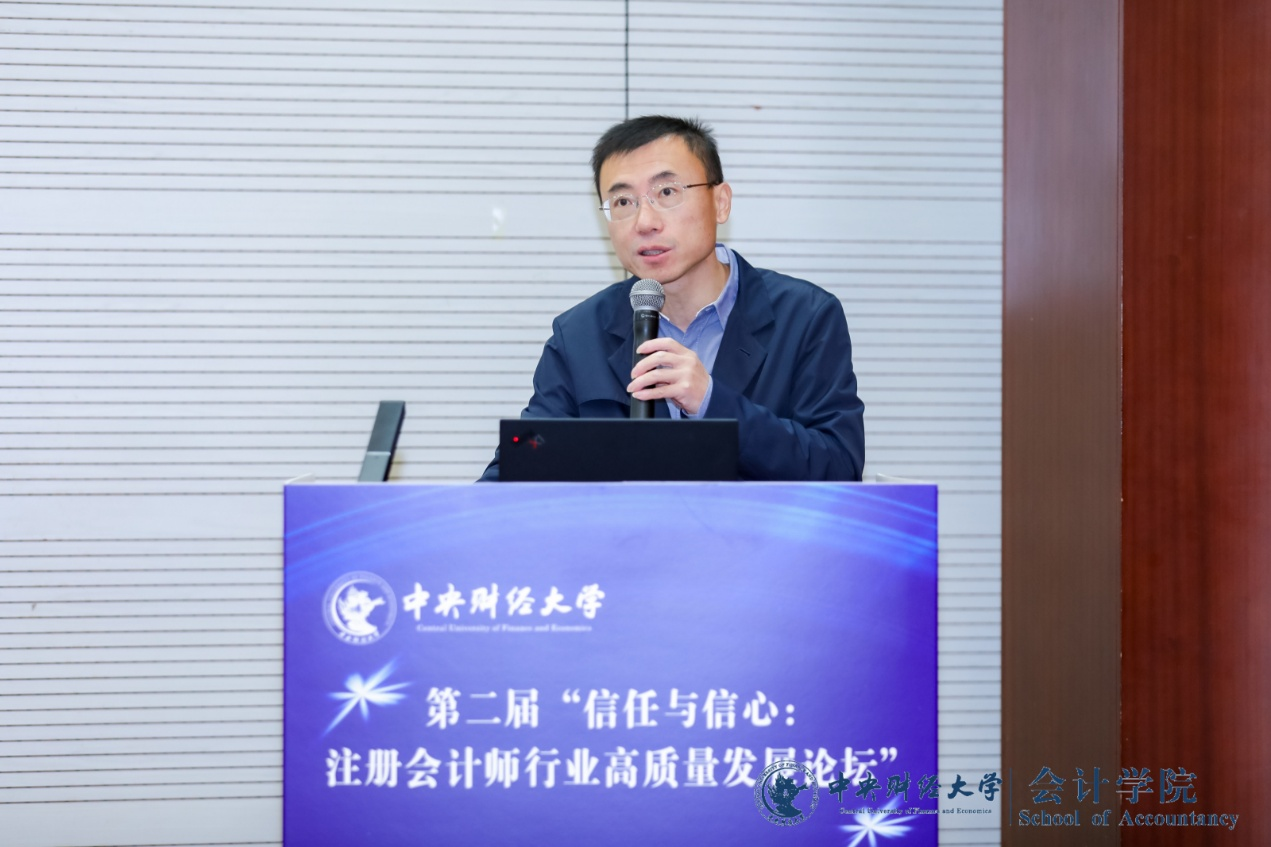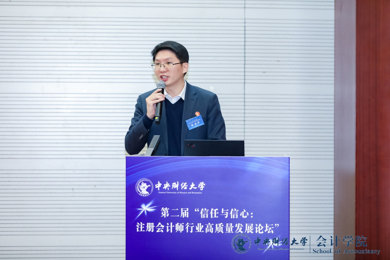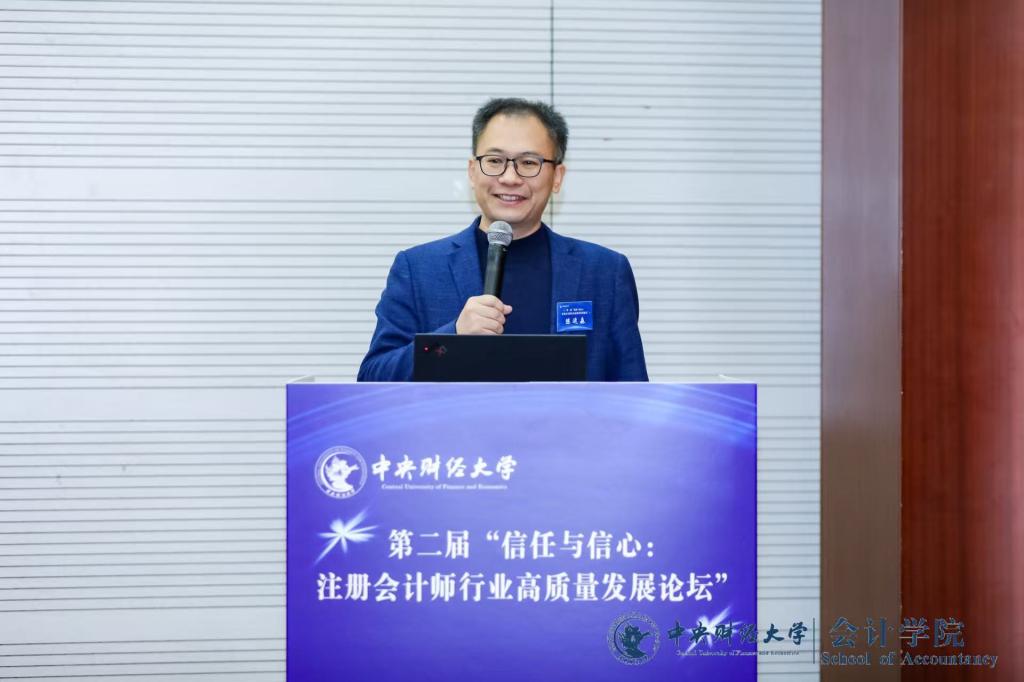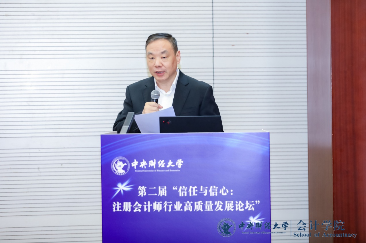 中央财经大学副校长陈斌开教授在致辞中对各位参会的专家和代表表示热烈欢迎和感谢。他强调了注册会计师行业在维护市场经济秩序和社会公众利益等方面的重要作用;同时指出行业在发展过程中面临的挑战,亟需凝聚共识。他祝愿各位来宾共同助力行业在新时代新征程上行稳致远。