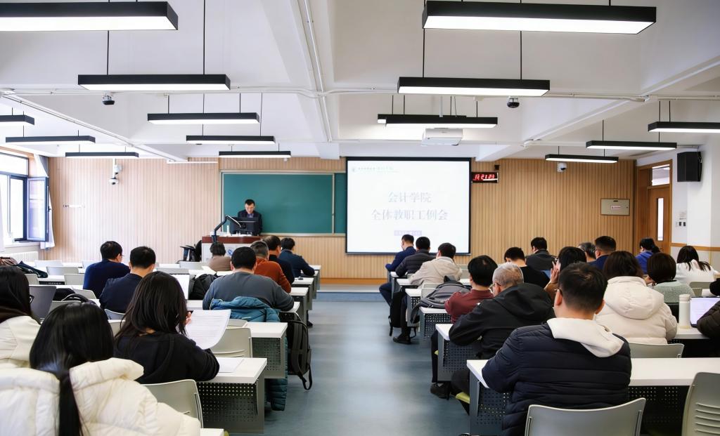 2026年3月11日下午,会计学院在学院南路校区主教楼319教室召开全体教职工会议,学习贯彻“中央财经大学2026年度工作布置会”精神。会议由院长吴溪主持。